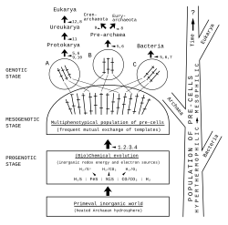 Dabei führte die frühe Evolution des Lebens nach seiner chemischen Entstehung (Eisen-Schwefel-Welt nach Günter Wächtershäuser[33], siehe oben) über einfache Stoffwechsel- und Replikationsvorgänge zur frühen Diversifizierung des Lebens durch die Entwicklung einer multiphänotypischen Population von Präzellen (pre-cells), d. h. nicht festgelegten, evolvierenden ersten Lebensformen mit unterschiedlichen Eigenschaften und verbreitetem genetischen Austausch (horizontaler Gentransfer). Aus der Population dieser Präzellen entwickelten sich dann die „founder groups“ A, B, C und daraus die Vorläuferzellen (hier proto-cells genannt) der drei Domänen des Lebens.