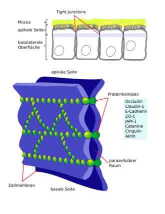 Die wichtigsten bisher bekannten Membranproteine der Tight Junctions sind die Familie der Claudine sowie das Occludin. Von der Familie der Claudine sind in Wirbeltieren bislang 24 verschiedene bekannt, in anderen Eukaryoten wie zum Beispiel dem Fadenwurm Caenorhabditis elegans sind es vier und in der Taufliege Drosophila melanogaster sieben. Diese integralen Membranproteine sind netzförmig angeordnet und bringen die Membranen zweier Zellen in einer Art Kopf-an-Kopf-Kontakt direkt aneinander. Sie bilden wässrige Poren, die selektiv bestimmte Ionen und Moleküle hindurchlassen, während andere zurückgehalten werden. Die Spezifität der Diffusionbarriere wird dabei durch die unterschiedliche Zusammensetzung der Claudine den jeweiligen Anforderungen, die das Epithel erfüllen muss, angepasst. Ein spezielles Claudin, Claudin 16, welches im Nierenepithel gefunden wurde, ist notwendig, um Mg2+-Ionen aus den Nieren in das Blut aufzunehmen. Eine Mutation in dem Gen, das dieses Protein kodiert, kann zu exzessivem Mg2+-Verlust in den Urin führen. Tight Junctions bilden mal losere (Beispiel: Darm), mal dichtere Barrieren (Beispiel: Blut-Hirn-Schranke). Die Tight Junctions des Dünndarms sind z. B. 10.000-mal durchlässiger für Ionen wie Na+ als die der Harnblase. Die Durchlässigkeit zwischen Epithelzellen kann jedoch auch vorübergehend verändert werden, falls ein erhöhter parazellulärer Transport erwünscht ist. Claudine und Occludine assoziieren mit intrazellulären Membranproteinen, ZO-Proteine nach der Zonula Occludens benannt, welche die Verbindung mit dem Aktin-Cytoskelett herstellen.