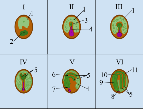 Phase I – Zygotenstadium nach der doppelten Befruchtung. Phase II – Proembryostadium: die Zygote teilt sich in den Proembryo und den Suspensor. Phase III – Kugelstadium. Phase IV – Herzstadium. Phase V – Torpedostadium: die Radicula nimmt eine Torpedoform an. Phase VI – Krückstockstadium: reifer Embryo.