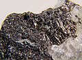 Dunkelgrau glänzende Selenkriställchen in Matrix aus der Absetzerhalde Lichtenberg, Ronneburg (Thüringen), Sichtfeld 5 mm -