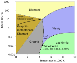 Kohlenstoff hat die höchste Temperaturbeständigkeit aller bekannten Materialien. Er sublimiert bei Normaldruck bei 3915 K (3642 °C),[10] ohne vorher an Festigkeit einzubüßen. Der Tripelpunkt liegt bei (10,8 ± 0,2) MPa und (4600 ± 300) K.[16][17]
