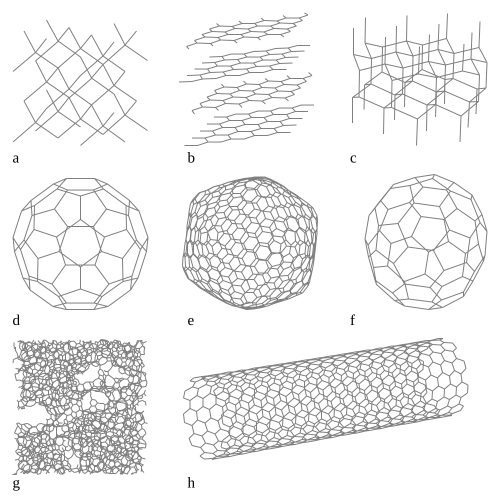 Ein reguläres hexagonales Wabenmuster, wie es die C-Atome in den Basalebenen des Graphits ausbilden, ist planar. Ersetzt man einige Sechsecke durch Fünfecke, entstehen gekrümmte Flächen, die sich bei bestimmten relativen Anordnungen der Fünf- und Sechsringe zu geschlossenen Körpern „aufrollen“. In den Fullerenen sind derartige Strukturen realisiert. Die sp2-Bindungen liegen dabei nicht mehr in einer Ebene, sondern bilden ein räumlich geschlossenes Gebilde. Die kleinste mögliche Struktur besteht nur noch aus Fünfecken und erfordert 20 Kohlenstoff-Atome, der dazugehörige Körper ist ein Pentagon-Dodekaeder. Dieses einfachste Fulleren ist bislang aber nur massenspektrometrisch nachgewiesen worden. Eines der stabilsten Fullerene besteht aus 60 Kohlenstoff-Atomen und enthält neben Sechsecken nur Fünfecke, die mit keinem anderen Fünfeck eine gemeinsame Kante besitzen. Das so entstehende Muster (abgestumpftes Ikosaeder, ein archimedischer Körper) gleicht dem Muster auf einem (altmodischen) Fußball. Es wird zu Ehren von Richard Buckminster Fuller als Buckminster-Fulleren bezeichnet. Die Molekül-„Kugeln“ der Fullerene sind untereinander über relativ schwache Van-der-Waals-Wechselwirkungen gebunden, ähnlich wie die Basalebenen im Graphit. Mittlerweile sind etliche Fullerene unterschiedlicher Größe isoliert und teilweise auch kristallisiert worden; sie können daher als echte Modifikation(en) gelten. Fullerene kommen vermutlich in allen Rußen vor, so zum Beispiel auch in dem Ruß über Kerzenflammen.