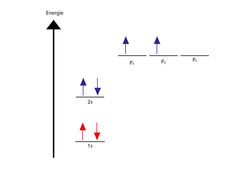 Das 2s-Niveau kann mit den 3 2p-Niveaus hybridisieren und 4 energetisch gleichwertige sp3-Orbitale bilden. Dies kann man anschaulich so erklären, dass eines der s-Elektronen in das vorher leere p-Orbital gehoben wird und sich dabei die Orbitalenergien aller vier Orbitale der zweiten Stufe angleichen. Die neu entstehenden Orbitale besitzen eine langgestreckte, asymmetrische Tropfenform. Waren die Formen der p-Orbitale punktsymmetrisch zum Mittelpunkt angeordnet, erscheinen sie jetzt keulenartig in eine Richtung vergrößert. Das Bild veranschaulicht die Hauptkeulen, die Nebenkeulen wurden übersichtlichkeitshalber fortgelassen. Die vier sp3-Orbitale sind mit größtmöglichem Abstand zueinander symmetrisch im Raum orientiert, sie zeigen in die Ecken eines imaginären Tetraeders.