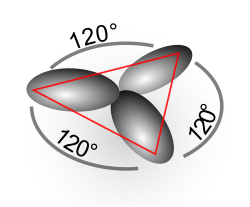 Sind nur 2 der 3 p-Orbitale an der Hybridisierung beteiligt, entstehen die so genannten sp2-Orbitale. Die sp2- Orbitale richten sich zweidimensional (als Fläche bzw. Ebene) aus; ober- und unterhalb dieser Fläche formt das übrigbleibende p-Orbital jeweils einen Orbitallappen. Steht beispielsweise das p-Orbital senkrecht auf der xy-Ebene, liegen die sp2- Orbitale trigonal in der xy-Ebene. Sie haben den gleichen Winkel von 120° zueinander. Das Bild links veranschaulicht die Situation. Das unhybridisierte p-Orbital ist der Übersichtlichkeit halber weggelassen.