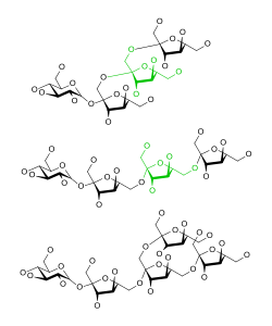 - 6-Kestosen: Ist der Fructosylrest über eine β-2,6-Bindung an den Fructosylrest der Saccharose verknüpft, spricht man von 6-Kestotriose oder Kestose. Fructane dieses Typs bezeichnet man manchmal als Levane oder Phleine.