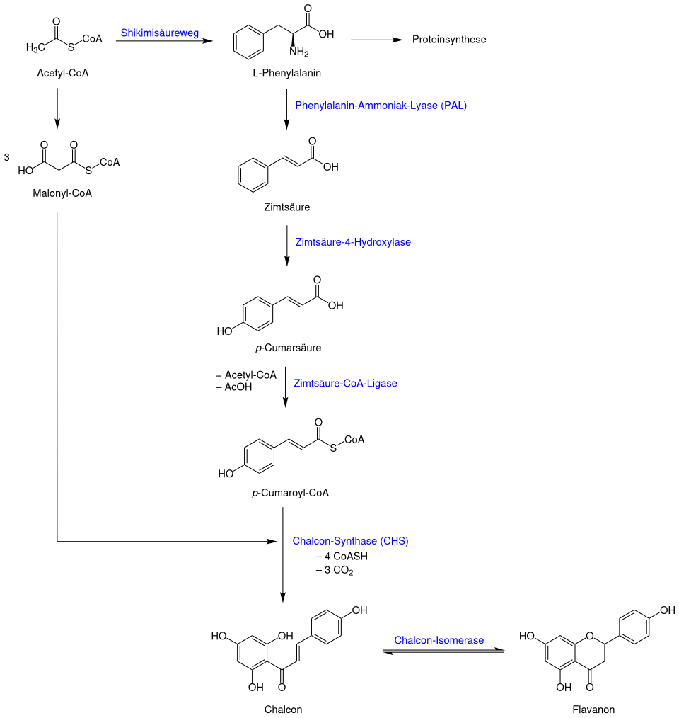Ausgangspunkt für die Biosynthese der Flavonoide ist die aromatische Aminosäure Phenylalanin, die über den Shikimisäureweg gebildet wird. Phenylalanin wird durch die Phenylalanin-Ammoniak-Lyase (PAL) in trans-Zimtsäure umgewandelt. Diese wird wiederum durch die Zimtsäure-4-Hydroxylase zu p-Cumarsäure hydroxyliert. Dieser Weg ist allen Phenylpropanoiden gemeinsam. Die p-Cumarsäure wird zu Cumaryl-Coenzym A aktiviert.[7]