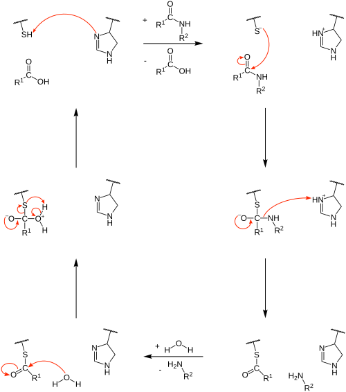 Dies geschieht folgendermaßen: Das Cystein wird basenkatalytisch durch das Histidin aktiviert, d. h., das Proton der Thiolgruppe wird auf den Stickstoff des Histidins übertragen (oben links im Bild). Das nun positiv geladene Histidin wird durch die negativ geladenen Aspartat-Seitenkette (nicht dargestellt) stabilisiert. Es erfolgt ein nucleophiler Angriff des Thiolats an das C1-Atom der Peptidbindung (oben rechts), sodass ein tetraedrischer Übergangszustand entsteht (mittig rechts). Der Stickstoff der Peptidbindung wird nun säurekatalytisch, d. h., er wird durch das Histidin protoniert abgespalten. Es liegt jetzt eine Thioesterbindung zwischen dem Enzym und dem Rest der Peptidkette vor, ein sogenanntes Acylenzym (unten rechts). Dieses Intermediat wird nun durch Wasser nucleophil am partiell positiv geladenen C1-Atom angegriffen (unten links). Es bildet sich wieder ein tetraedrischer Übergangszustand, bevor das restliche Peptid mit neuer Carboxygruppe abgespalten wird und das verbleibende Proton vom Wasser, die jetzt wieder freie Cysteinseitenkette zum Thiol protoniert (mittig links). Es liegen somit jetzt zwei Teilpeptide mit einem neuen Aminoterminus bzw. einem neuen Carboxylterminus vor.