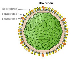 Das Virion besitzt eine Virushülle und ein 28 nm großes, ikosaedrisches Kapsid. Das Kapsid ist aus 180 Kopien des HBV-Kernproteins (auch hepatitis B core antigen HBcAg) aufgebaut und umschließt die virale DNA und eine DNA-abhängige DNA-Polymerase mit einer Reverse-Transkriptase-Aktivität (RT), ähnlich einer retroviralen Polymerase.[10] Die Virushülle enthält als Membranprotein das HBsAg und das Pre-S1-Protein zur Bindung an die Wirtszelle.[5] Mit einem Durchmesser von 42 nm gehört das sphärische HBV (auch Dane particle genannt) eher zu den kleineren Tierviren.[11]