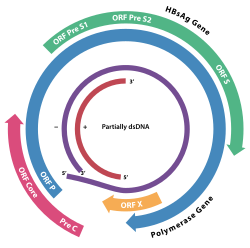 Das Genom des HBV besteht aus zirkulär-geschlossener DNA, jedoch ist die DNA nicht vollständig doppelsträngig und ein Strang durchgängig.[11] Ein Ende des durchgängigen Strangs von circa 3020–3320 Nukleotide bindet die virale DNA-Polymerase, während der kürzere Strang mit 1700 bis 2800 Nukleotiden deutlich kürzer ist.[14]