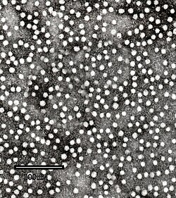 Es existieren auch nicht-infektiöse filamentöse Formen ohne Kapsid von 22 nm Durchmesser als Sphäre bzw. auch als Röhrenform, da HBsAg im Überschuss in der Leber Infizierter gebildet wird und im Blut zirkulieren.[11][4] Diese Virosomen bestehen aus HBsAg in einer Lipiddoppelschicht.[12] Aufgrund der Immunogenität ohne Infektiosität wurden sie bei der ersten Generation von Hepatitis-B-Impfstoffen als sogenannte Plasmaimpfstoffe verwendet.[4] Mittlerweile werden HBV-Impfstoffe gentechnisch erzeugt. Das HBcAg kann bei rekombinanter Expression (ohne HBsAg) ebenfalls Virosomen bilden.[13]