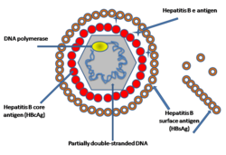 Das Hepatitis-B-Virus (HBV) ist ein behülltes DNA-Virus mit überwiegend doppelsträngigem Genom und der Auslöser der Hepatitis B.[2] Das Hepatitis-B-Virus entstammt der Gattung Orthohepadnavirus innerhalb der Familie der Hepadnaviridae.[3]