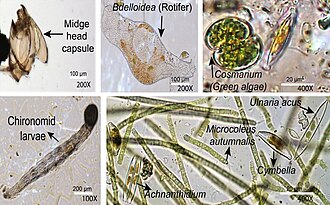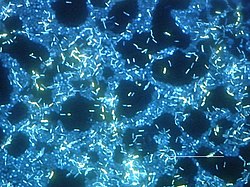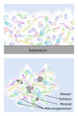 Biofilme bestehen aus einer Schleimschicht (einem Film), in der Mischpopulationen (vgl. Konsortien) von Mikroorganismen (z. B. Bakterien, Algen, Pilze, Protozoen) in Konzentrationen von bis zu 1012 Zellen je Milliliter Biofilm eingebettet sind.[1] Mehrzellige Organismen wie Rädertierchen, Fadenwürmern, Milben, Wenigborstern oder Insektenlarven, die sich von den Mikroorganismen ernähren, können sich ebenfalls ansiedeln.[1] Biofilme werden im Alltag oft als sich glitschig-weich anfühlende, wasserhaltige Schleimschicht oder Belag wahrgenommen. Andere, umgangssprachliche Bezeichnungen sind Aufwuchs, Kahmhaut oder Sielhaut.