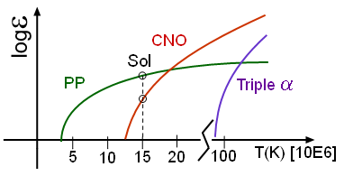 Für Sterne mit mehr als einer halben Sonnenmasse kann der Kern eine Temperatur erreichen, bei der es möglich wird, dass Kohlenstoff aus Helium über den Drei-Alpha-Prozess erzeugt wird.