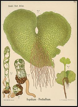 Bei den Farnen hingegen sind die Gametophyten (genannt: Prothallium) so stark reduziert, dass sie kaum je wahrgenommen und leicht mit einem Lebermoos verwechselt werden können. Bei den Farnpflanzen ist der oben sichtbare grüne hochwachsende Teil der Pflanze der Sporophyt. Auf der Zeichnung von Otto Wilhelm Thomé (links) sieht man rechts unten einen Gametophyten (Prothallium), aus dem der neue Sporophyt austreibt. An den Blättern des Sporophyten sitzen Sporangien, aus denen die Sporen abgegeben werden.