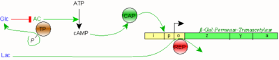 Bei der Katabolitrepression bewirkt nach der ursprünglichen Annahme ein Katabolit des Glucosestoffwechsels eine Hemmung der Genexpression bestimmter, für die Verarbeitung anderer Kohlenstoffverbindungen relevanter Gene, z. B. im Lac-Operon.[2] Jedoch wurde nach der Benennung des beobachteten Effekts entdeckt, dass nicht ein Katabolit der Glucose die Genexpression hemmt, sondern der second messenger cAMP, der bei Glucosemangel gebildet wird und an das Catabolite activator protein (CAP, auch cAMP response protein,[2] CRP) bindet. Nach der cAMP-Bindung wirkt das dimere CAP-Protein als Aktivator der Genexpression.[2] Glucose führt zu einer erniedrigten cAMP-Konzentration.[2] Die Katabolitrepression ist somit eine Aktivierung der Genexpression bei Abwesenheit des Substrats. Nebenbei besitzt das lac-Operon auch den Lac-Repressor, der bei Bindung von Allolactose (einem Stoffwechselprodukt der Lactose) den Promotor freigibt.[2]