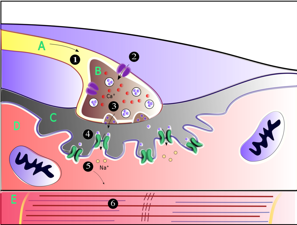 (5) Diese Bindung führt zur Öffnung von Ionenkanälen und ermöglicht den Einstrom von Natriumionen durch die Membran in die Muskelzelle.