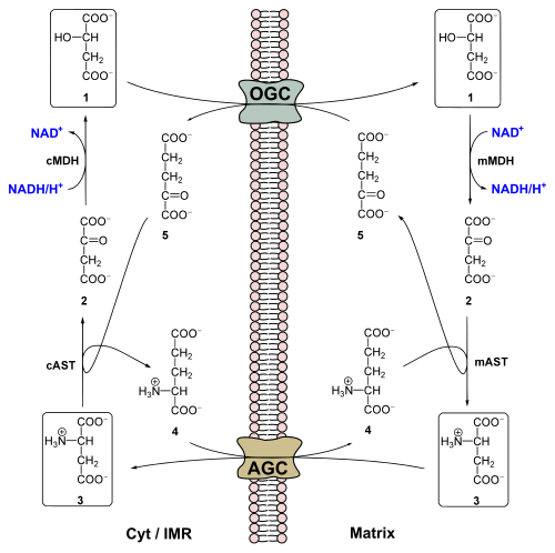 Im Inneren des Mitochondriums oxidiert eine mitochondriale Malatdehydrogenase das importierte Malat wieder zu Oxalacetat, wobei NAD+ zu NADH+H+ reduziert wird. Die eigentliche Transportfunktion des Shuttles ist damit bereits erfüllt, allerdings sind zur Aufrechterhaltung des Zyklus noch weitere Schritte notwendig. So wird das Oxalacetat im Mitochondrium über eine mitochondriale Aspartat-Aminotransferase[3] (mAST) Glutamat-abhängig zu Aspartat aminiert. Dabei wird aus Glutamat α-Ketoglutarat gebildet. Das Glutamat stammt aus dem Cytosol, wobei es durch den Aspartat-Glutamat-Carrier gegen das entstandene Aspartat ausgetauscht wird.