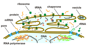Alle in membranengebundenen Ribosomen entstehenden Polypeptidketten werden zunächst in das Lumen des ER geschleust. Dies geschieht durch porenbildende Proteine (Kotranslation). Auch im Zytosol synthetisierte Proteine werden in das Lumen des ER befördert (Posttranslation). Im Lumen des ER werden die Polypeptidketten zurechtgeschnitten und gefaltet.
