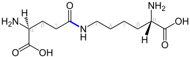 Ein Beispiel dafür wäre eine Amidbindung zwischen der seitenständigen ε-Aminogruppe von L-Lysin und der seitenständigen Carboxygruppe von L-Asparaginsäure oder L-Glutaminsäure. Die Verknüpfung der Aminosäuren erfolgt also nicht (ausschließlich) über α-ständige Amino- und Carboxygruppen.[1] Isopeptidbindungen werden beispielsweise bei der kovalenten Verknüpfung von Fibrin im Rahmen der Blutgerinnung durch den Faktor XIII zwischen Lysin und Glutamin geschlossen.