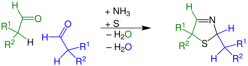 Alternativ können 3-Thiazoline auch aus α-Mercaptoaldehyden oder α-Mercaptoketonen, einer Oxokomponente (Aldehyd oder Keton) und Ammoniak entstehen.[3] Damit die Reaktion ablaufen kann, muss an das α-Kohlenstoffatom (Kohlenstoffatom neben dem Carbonyl-Kohlenstoffatom) mindestens ein Wasserstoffatom gebunden sein (sowohl bei der Reaktion mit einem Aldehyd als auch bei der mit einem Keton).