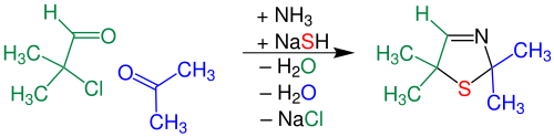 Eine universellere Variante der Asinger-Reaktion wurde bei der Degussa AG entwickelt. Dabei reagiert eine α-halogenierte Carbonyl-Komponente mit Natriumhydrogensulfid und generiert in situ eine α-Mercapto-Carbonyl-Komponente (Thiol), welche direkt mit Aldehyden oder Ketonen und Ammoniak zu 3-Thiazolinen weiterreagieren:[4]