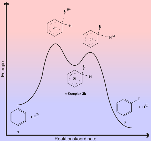 Der Reaktionsmechanismus in Abbildung 1 beschreibt den allgemeinen Ablauf einer elektrophilen aromatischen Substitution. Der Aromat 1 steht in Wechselwirkung mit dem Elektrophil E+. Man spricht von der Bildung des π-Komplexes 2a. Aus diesem, oder direkt aus den Ausgangsstoffen bildet sich unter Aufhebung der Aromatizität von 1 der mesomeriestabilisierte σ-Komplex 2b, der auch Arenium-Ion oder Wheland-Komplex genannt wird. Unter Deprotonierung dieses Komplexes findet eine Rearomatisierung des Systems statt, und das Endprodukt 3 wird freigesetzt. Die Bildung eines π-Komplexes ist nicht zwingend für die Erklärung der Reaktion notwendig.