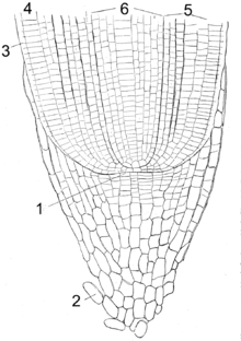 Das Meristem ist durch die Wurzelhaube (Kalyptra) geschützt. Die Wurzelhaube besteht aus parenchymatischen Zellen, deren Mittellamellen verschleimen und so das Vordringen der Wurzel in den Boden erleichtern. Die Zellen werden laufend abgestoßen und vom Vegetationspunkt her neu gebildet. Der Schleim verändert durch das Verkleben mit Tonteilchen auch die Bodenstruktur. Die negative Ladung der Schleime spielen auch eine Rolle bei der Absorption von Nährstoffen und potenziell schädlichen Ionen (Aluminium, Cadmium).[4] Der Schleim wird zwar nur von der Wurzelhaube gebildet, bleibt beim Weiterwachsen der Wurzel aber auch an der Exodermis und den Wurzelhaaren kleben. Dadurch bildet sich bei Gräsern um die jungen Wurzelteile oft eine Wurzelscheide aus verklebten Bodenteilchen.