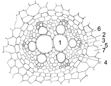 Dieses Kambium gliedert nun nach innen Xylem- und nach außen Phloemelemente ab. Der zunächst stärkere Xylemzuwachs führt zu einer Abrundung des Kambiums, das schließlich zylinderförmig wird. Während des Wachstums werden ähnlich wie in der Sprossachse primäre Markstrahlen und sekundäre Strahlen gebildet. Die ersten Strahlen entstehen über den primären Xylempolen.