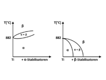 Reines Titan (Element) kann in zwei verschiedenen Kristallmodifikationen vorliegen. Oberhalb 882 °C als Hochtemperaturphase β-Titan im krz Kristallgitter und unterhalb 882 °C als hexagonales (hdp) α-Titan. Beim Zusatz von Legierungselementen bildet sich ein Mischkristallbereich, wobei man Elemente unterscheidet, die den α-Bereich stabilisieren (Al, Sn, Zr, O, N) und solche, die den β-Bereich stabilisieren (Mo, Fe, V, Cr, Nb). Siehe dazu Abbildung 11.