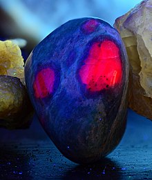 Rubine zeigen bei der Anregung mit UV-, blauem oder grünem Licht eine kräftige rote Fluoreszenz, mit zwei Emissionslinien bei 692,80 und 694,30 nm Wellenlänge. Die entsprechenden Absorptionsbanden für die Anregung liegen bei 250, 410 und 550 nm.