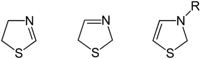 - 2-Thiazoline (alternativer Name: 4,5-Dihydrothiazole) enthalten eine C=N-Doppelbindung zwischen dem Kohlenstoffatom 2 und dem Stickstoffatom