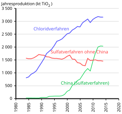 Da die Hauptmenge des technisch hergestellten TiO2 als Pigment verwendet wird, stören färbende Ionen wie Eisen. Als Erze werden für das Sulfatverfahren in der Regel Ilmenit (FeTiO3) oder titanhaltige Schlacken aus der Elektroreduktion des Ilmenits eingesetzt.[34] Diese Schlacke, genau wie Rutil aus alluvialen Lagerstätten, kann auch im technisch anspruchsvolleren Chloridverfahren eingesetzt werden. Beide Verfahren erhöhen die Reinheit des Titanoxids deutlich. Die Summe der färbenden Ionen liegt in der Regel unter 200 ppm beim Sulfatverfahren, hauptsächlich Niob, untergeordnet Eisen, und weniger als 50 ppm beim Chloridverfahren, Niob und Eisen.