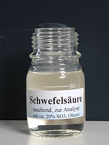 Schwefelsäure kann Schwefeltrioxid in beliebigen Mengen lösen. Das Gemisch bezeichnet man als Oleum (CAS-Nummer 8014-95-7) oder rauchende Schwefelsäure, da das enthaltene Schwefeltrioxid leicht aus der Lösung entweicht und mit der Luftfeuchtigkeit Nebel („Rauch“) aus verdünnter Schwefelsäure bildet. Die Konzentration des Oleum wird in Gewichts-% des in 100 %iger Schwefelsäure gelösten SO3 angegeben. Mit Oleum werden in der organischen Chemie bei der Sulfonierung von Aromaten, Alkenen und Aliphaten oder bei der Sulfatierung von Hydroxyverbindungen Sulfonsäuregruppen eingefügt. Damit werden beispielsweise Tenside für die Waschmittelindustrie und Vorprodukte für die Farbstoff- und Pigmentproduktion (Buchstabensäuren) hergestellt.