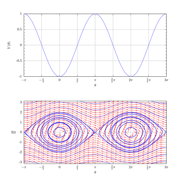Phasendiagramme des Pendels mit durchgehender blauer Separatrix mit Sattelpunkten in den scheinbaren Schnittpunkten. Die Separatrix umhüllt die geschlossenen Kurven (periodische Bewegung mit Zentrum)