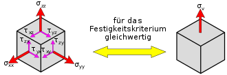 Anhand der Vergleichsspannung kann der wirkliche, i. A. dreidimensionale Spannungszustand im Bauteil in der Festigkeits- oder in der Fließbedingung mit den Kennwerten aus dem einachsigen Zugversuch (Material-Kennwerte, z.B. Streckgrenze oder Zugfestigkeit) verglichen werden.