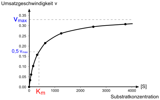 Eine Kenngröße für eine enzymatische Reaktion ist die Michaeliskonstante Km. Sie hängt von der jeweiligen enzymatischen Reaktion ab. Km gibt die Substratkonzentration an, bei der die Umsatzgeschwindigkeit halbmaximal ist (v = ½·vmax), die also bei Halbsättigung vorliegt. Sie ergibt sich als