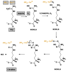 Es handelt sich um die Fünf-Elektronen-Oxidation (siehe Reaktionsschema) eines der Guanidino-Stickstoffatome von L-Arginin, die in zwei Schritten mit dem Intermediat NOHLA abläuft.[2]