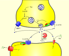 Serotonin, das sich im Zentralnervensystem in den Zellkörpern, den Somata serotoninerger Nervenbahnen in den Raphe-Kernen befindet, deren Axone in alle Teile des Gehirns ausstrahlen, beeinflusst unmittelbar oder mittelbar fast alle Gehirnfunktionen. Zu den wichtigsten Funktionen des Serotonins im Gehirn, das die Blut-Hirn-Schranke nicht überwinden kann und daher vor Ort gebildet werden muss, zählen die Steuerung oder Beeinflussung der Wahrnehmung, des Schlafs, der Temperaturregulation, der Sensorik, der Schmerzempfindung und Schmerzverarbeitung, des Appetits, des Sexualverhaltens und der Hormonsekretion. Serotonin fungiert dabei einerseits als Neurotransmitter im synaptischen Spalt, andererseits wird es diffus über freie Nervenendungen ausgeschüttet und wirkt als Neuromodulator.