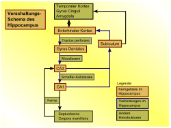 - Die Hippocampusformation ist einzigartig in ihrer Vulnerabilität für starke emotionale Stressoren; Tiermodelle zeigen hippocampale Atrophie als Effekt von chronischem emotionalen Stress (bedingt durch Absterben hippocampaler Neurone sowie Reduktion neuronaler Genese im Gyrus dentatus),[7] und Menschen mit schweren emotionalen Traumata (bspw. Vietnam-Veteranen oder Opfer sexuellen Kindesmissbrauchs) zeigen ebenfalls eine Volumenreduktion der Hippocampusformation.[8][9]