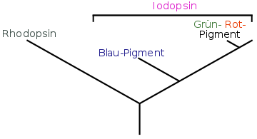 Die Aminosäuresequenz des Rot-Photopsins unterscheidet sich nur in 15 der 364 Aminosäuren vom M-Photopsin, zum S-Photopsin und zum Skotopsin des Rhodopsins bestehen wesentlich mehr Unterschiede.