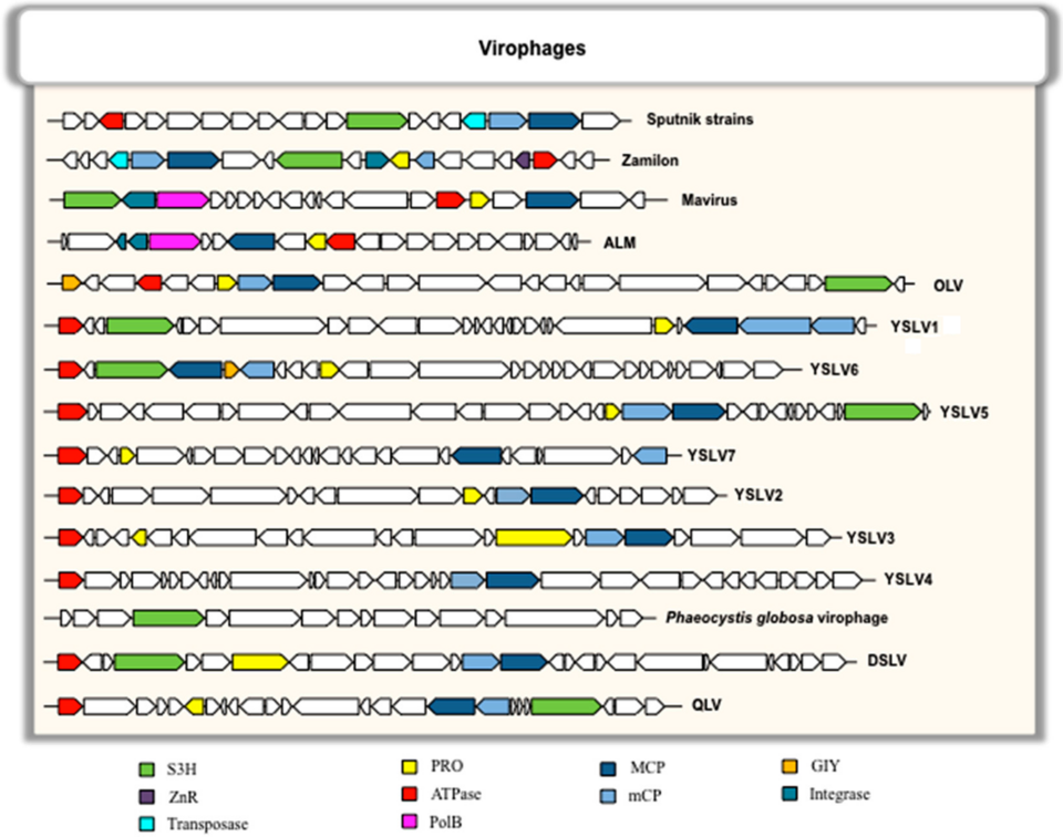 - „Preplasmiviricota sp. Gezel-14T“ (PLV ‘Gezel-14T) alias Phaeocystis globosa Virus Virophage (PgVV)[A. 9][27][28][29][6][5]