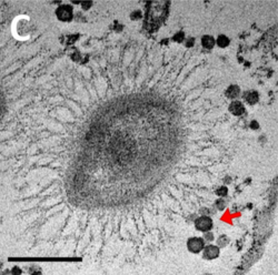 Als Virophagen[A. 1] klassifiziert man nicht-taxonomisch einen speziellen Typ vergleichsweise großer Satellitenviren aus dem Phylum Preplasmiviricota, die sich nur in Co-Infektion mit Riesenviren des Phylums Nucleocytoviricota (NCLDVs) als Helferviren in eukaryotischen Wirtszellen replizieren können. Virophagen replizieren (anders als die Begriffliche Anlehnung an Bakteriophagen nahelegen könnte) nicht „in“ anderen Viren, sondern nutzen als Satellitenviren den Syntheseapparat der Helferviren – und treten dabei in eine Konkurrenz zu ihnen.[1][2] Dabei werden Genprodukte des Helfervirus genutzt, die sonst nur bei eukaryotischen Zellen (Eucyten) die Proteinsynthese ermöglichen, daher werden die Helferviren der Virophagen auch Mamaviren[A. 2] genannt. In der Regel wird die Proteinsynthese des Mamavirus dabei mehr oder weniger beeinträchtigt.[3][4] Virophagen sind daher (bzgl. der Mamaviren) parasitäre Satellitenviren. Daher werden die Helfer- oder Mamaviren auch als „virale Wirte“, die co-infizierten Eucyten zur Abgrenzung dann auch als „zelluläre Wirte“ bezeichnet. Die Virophagen der Riesenviren sind im Vergleich zu Satellitenviren anderer Helferviren ebenfalls vergleichsweise riesig und haben auch ein komplexeres Genom als diese.[5]