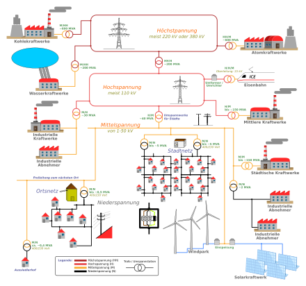 - Hochspannung: 60 kV bis 150 kV. In Deutschland und Österreich wird fast durchgängig 110 kV verwendet. Daneben existieren noch in Schleswig-Holstein, bei Winsen (Aller), in der Nähe von Landesbergen, bei Philippsthal und im alten Netz der Städtischen Werke Kassel Leitungen mit 60 kV Betriebsspannung. Im Saarland wird ein Netz an 65-kV-Leitungen betrieben. In der Schweiz existiert kein einheitlicher Wert im Hochspannungsnetz.