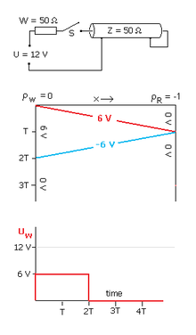 Signalreflexionen an falsch bemessenen Lastwiderständen lassen sich besonders einfach beschreiben, wenn sich die Spannung am Kabelanfang sehr schnell ändert und anschließend konstant bleibt. Dieser Spannungssprung durcheilt das Kabel mit fast Lichtgeschwindigkeit und kann am Kabelende – abhängig vom Reflexionsfaktor – reflektiert werden. Anschließend ist Lastspannung für den Zeitraum 2·T konstant und errechnet sich wie bei jeder Superposition zu: