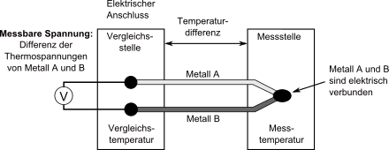 Um eine elektrische Spannung an den beiden Leiterenden messen zu können, muss der Rückleiter aus einem andersartigen Material als der Hinleiter ausgeführt sein, wie in der schematischen Messschaltung dargestellt. Bei demselben Material in beiden Leitern entstünden jeweils betragsmäßig gleich hohe Potentialdifferenzen, die sich in einem geschlossenen Stromkreis gegenseitig aufheben würden. Die Verbindungsstelle eines Thermoelements, die der zu messenden Temperatur ausgesetzt ist, bekommt die Funktion einer Messstelle,[1] der Übergang auf die zum Spannungsmessgerät führenden (Kupfer-)Leitungen bekommt die Funktion einer Vergleichsstelle. (Jede weitere temperaturbedingte Potentialdifferenz längs der Zuleitungen fällt bei gleichen Leitungen aus der Spannungsmessung heraus.)