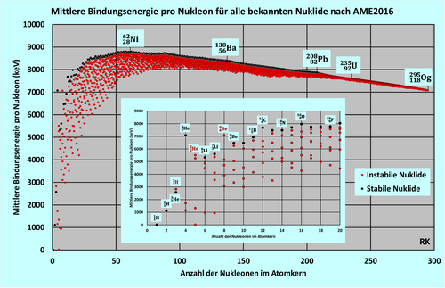 Die Bindungsenergie der Nukleonen vermindert die Gesamtmasse, die sich als Summe der Massen der einzelnen Kernbausteine ergeben würde. Diese Massendifferenz