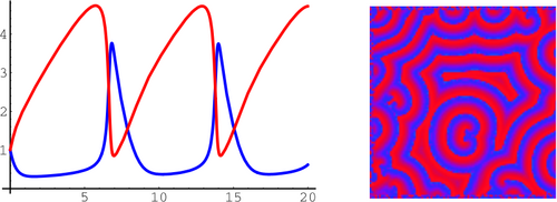 Brüsselator: Konzentrationsverlauf der beteiligten Reaktanten (links) und Simulation auf einem zellulären Automaten (rechts)