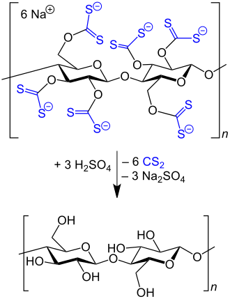 Die Herstellung von – je nach Form der Düse – Viskosefasern oder „Cellophan“-Folien auf Cellulose-Basis kann nach dem Xanthogenat-Verfahren erfolgen. Diese Reaktionsführung wurde 1892 von Charles Frederick Cross und Edward John Bevan patentiert,[4] die erste Folienherstellung durch Wiederausfällung der Cellulosephase 1898 von Charles Henry Stearn.[5] Dabei wird der Zellstoff zuerst einige Stunden mit Natronlauge behandelt (Mercerisation). Unter Zusatz von Schwefelkohlenstoff entsteht dann innerhalb von zwei bis drei Stunden das Xanthogenat; dabei wird nur ein Teil der Hydroxygruppen der Glucose-Einheiten verestert. Die durch das Nebenprodukt Natriumtrithiocarbonat braun verfärbte Masse wird durch Zugabe weiterer Natronlauge zu einer kolloidale Lösung verdünnt, deren noch hohe Viskosität der Faser ihren Namen gab. Das Einpressen in ein schwefelsaures Fällbad liefert dann wieder feste Cellulose.[6]