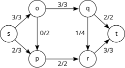 Sei das Flussnetzwerk mit den Knoten {\displaystyle V=\{s,o,p,q,r,t\}} gegeben, und ein maximaler Fluss von der Quelle {\displaystyle s} zur Senke {\displaystyle t} der Größe 5.