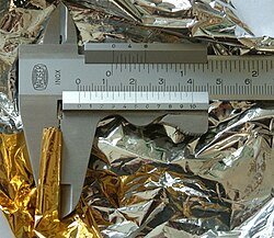 - Bei jedem Falten verdoppelt sich die Dicke von Papier oder Folie.[8] Auf diese Weise lassen sich dünne Folien mit einem einfachen Messschieber ausmessen. Die Mylarfolie auf dem Bild besteht nach fünffachem Falten aus 25 = 32 Lagen Folie, die gemeinsam eine Dicke von 480 µm haben. Eine Folie ist also ca. 15 µm stark. Nach zehnfachem Falten wäre die Lage bereits 15 mm dick, nach weiteren 10 Faltungen mehr als 15,7 m. Da sich auch die Stapelfläche exponentiell verringert, lässt sich Papier in einem handelsüblichen Papierformat kaum mehr als sieben Mal zusammenschlagen.